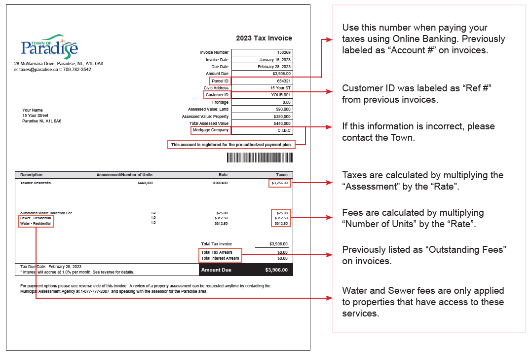The Town of Paradise municipal tax bills are issued each year in January. Property taxes are a primary source of revenue for municipalities and are used to support Town services and programs. Tax balances owing after March 28, 2025 are charged interest at a rate of 1.0% per month.
