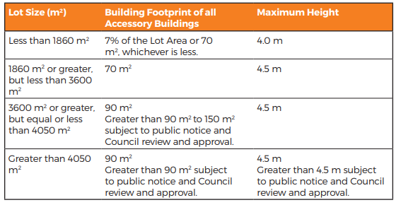 The maximum permissible size of a residential accessory building depends on the area of the lot. Please refer to the table below: